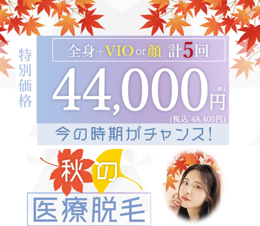 通常価格では、全身脱毛(1回)が82,500円ですが、キャンペーン期間中は、全身脱毛に顔またはVIO脱毛5回がセットで約50,000円になるなど、大きな割引が適用されることがあります。